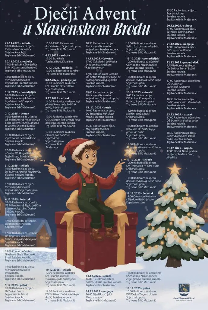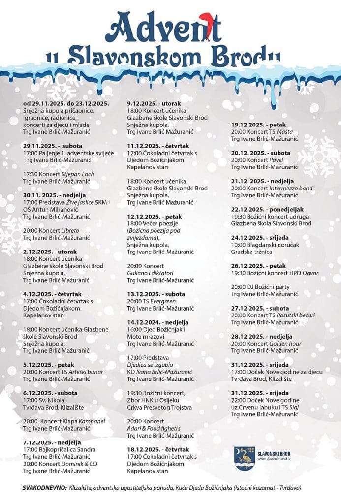 Grad Slavonski Brod – Ove je godine predstavio iznimno sadržajan i vizualno dojmljiv Advent, koji se održava na dvjema središnjim gradskim pozornicama – Trgu Ivane Brlić-Mažuranić te u prostoru obnovljene tvrđave Brod. Riječ je o manifestaciji koja kroz bogat glazbeni i kulturno-zabavni program, uz niz dodatnih popratnih sadržaja, stvara snažan blagdanski identitet grada te potvrđuje Slavonski Brod kao jedno od najatraktivnijih adventskih odredišta regije.