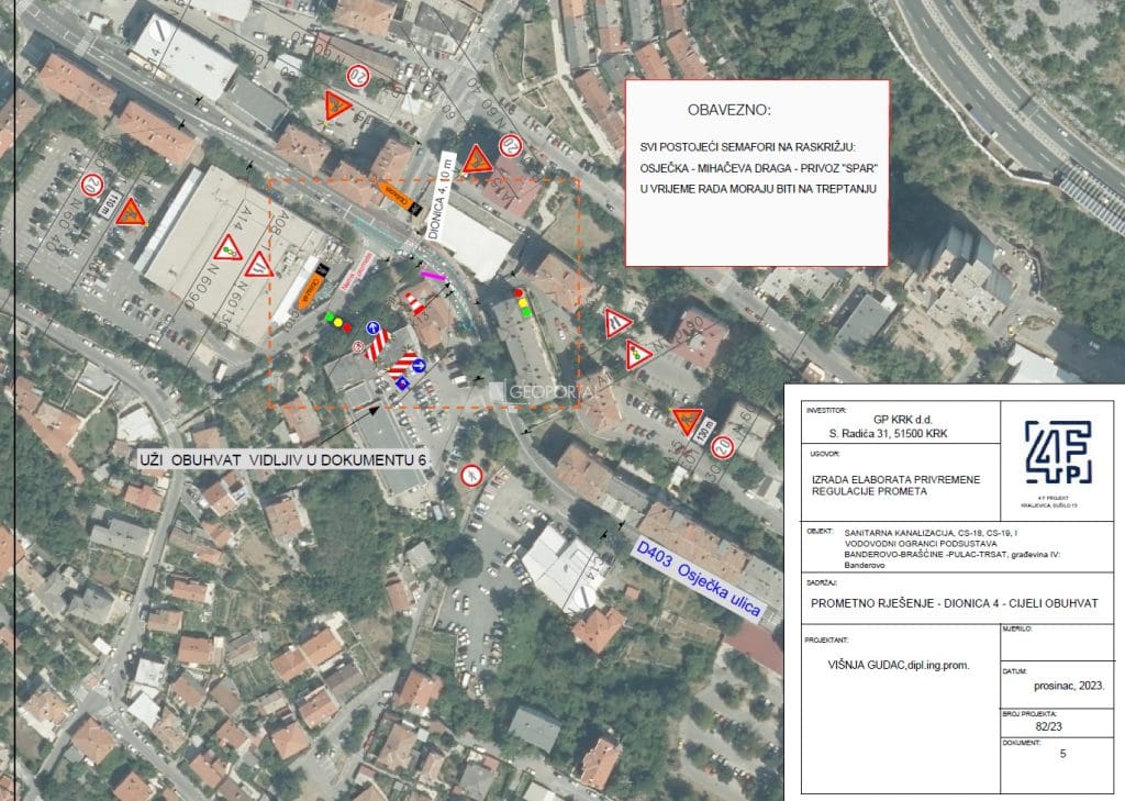 Za vrijeme izvođenja radova promet će se odvijati uz naizmjenično propuštanje vozila po slobodnoj – sjevernoj prometnoj traci, regulirano gradilišnim semaforima.
