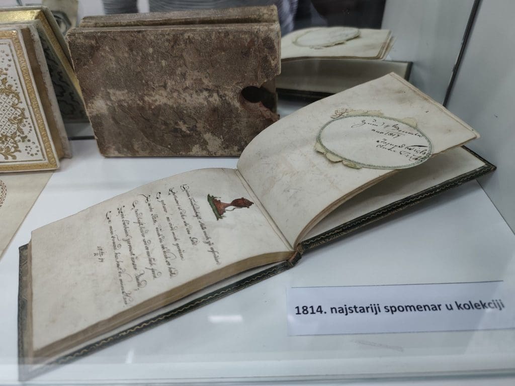 Supružnici Novaković ponosno ističu kako u zbirci imaju nekoliko spomenara iz 19. stoljeća, te kako su neki od primjeraka iz njihove kolekcije preživjeli tri rata. Od impresivnog broja od ukupno 900 spomenara s kojima raspolažu u svojoj kolekciji, na izložbi je izložen 81 spomenar, najstariji je iz 1814., a najmlađi iz 2020. godine. Ovdje se mogu pronaći i upisi i crteži nekih poznatih osoba, među kojima bi istaknuli onaj slikara Iva Kaline.